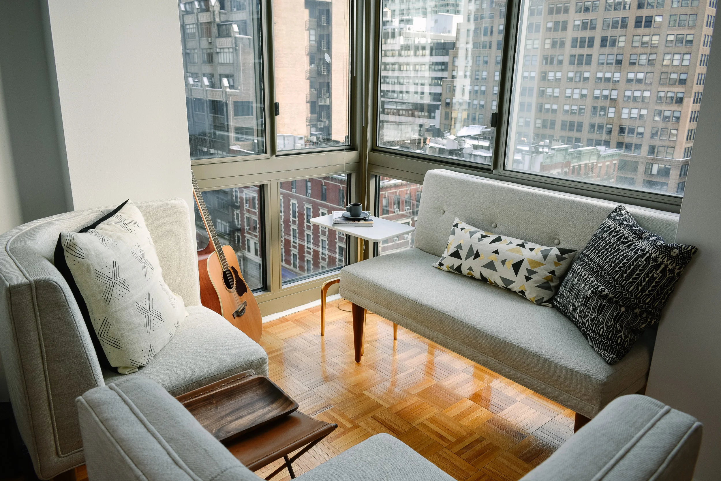 My couch is normally situated in the corner window overlooking Hell’s Kitchen, but before our new wall bed arrives, I decided to have some fun and show you the different configurations.